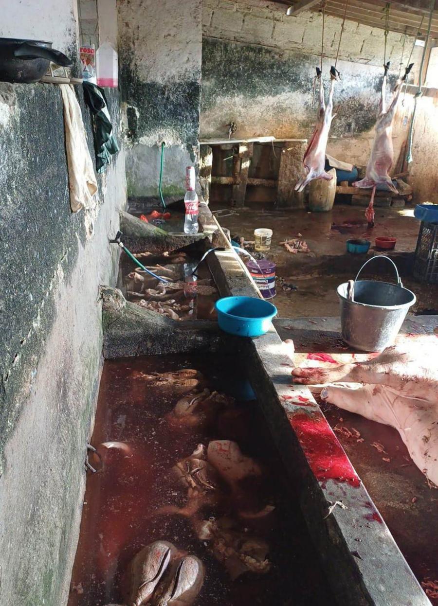 No interior do matadouro, foram localizadas diversas carcaças de carneiros e suínos, abatidos em condições de extrema insalubridade, com descarte irregular de resíduos, presença de urubus e forte odor, caracterizando risco iminente à saúde pública e ao meio ambiente.