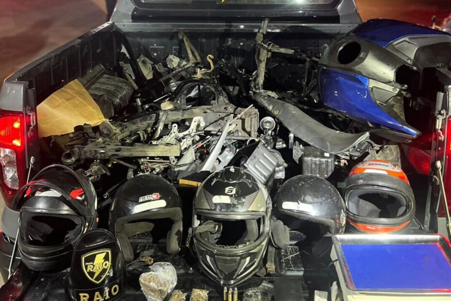 Durante a averiguação, foram encontrados três chassis de motocicletas com queixa de roubo, carenagens e capacetes. Além disso, cerca de 250 gramas de maconha e uma balança de precisão também foram apreendidos.
