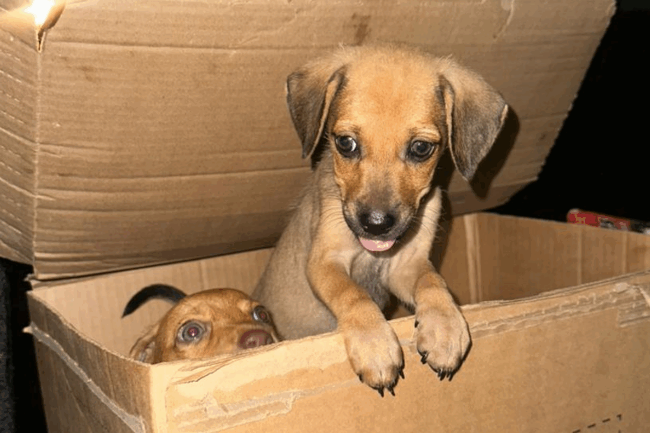 Ao verificar o interior, ela constatou a presença de dois filhotes, aparentemente das raças Pinscher ou Dachshund (salsicha). No local também havia um pano e um saco plástico contendo uma pequena quantidade de ração.