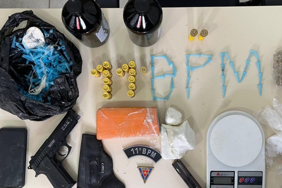 Durante as diligências, foram apreendidos 412g de maconha; 291g de cocaína; 194g de crack; 19 munições (entre calibre 20 e 380); um carregador de pistola; um simulacro de pistola, além de uma balança de precisão; aproximadamente dois litros de produto utilizado para a produção de “loló” e um coldre para revólver.